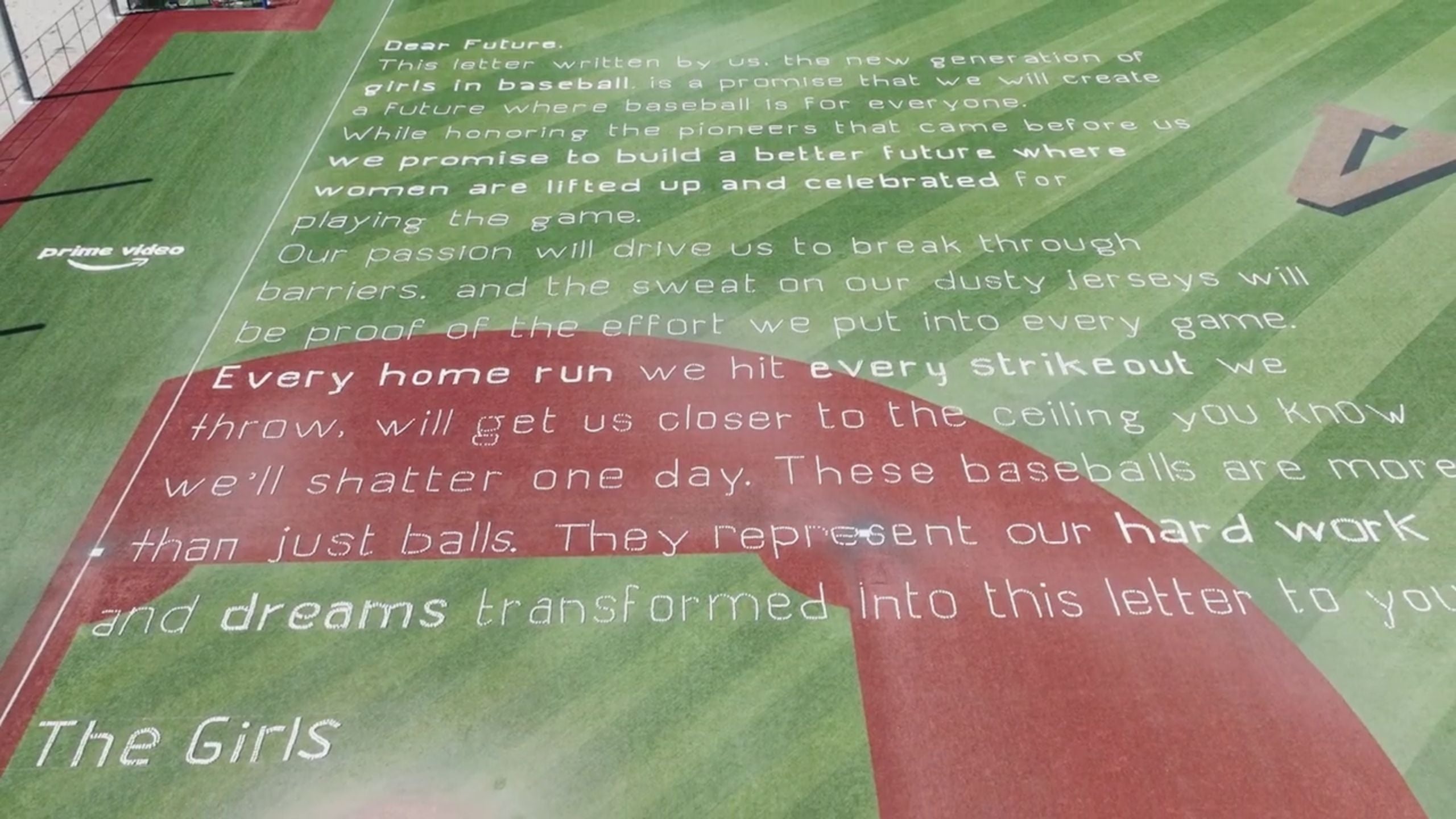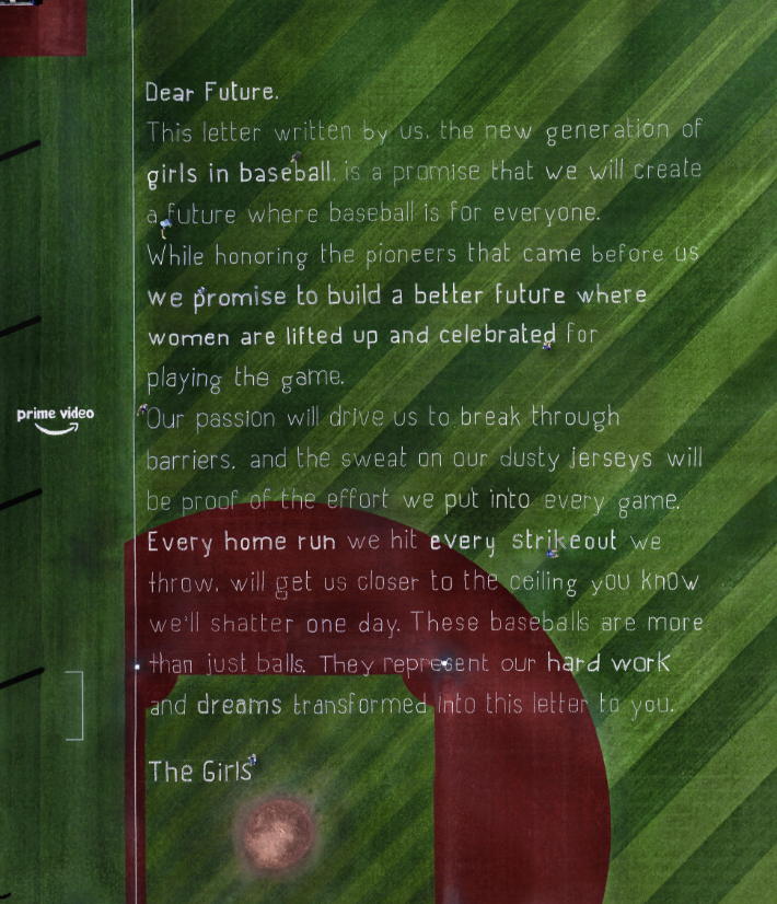 We needed an idea that could inspire female athletes to dream big and swing for the fences, just like the women from the series did decades ago. Our answer was to write a heartfelt letter to the future from the girls of today, using nothing but baseballs. It was a bold promise to the next generation of female ballplayers, pledging to fight for a more equal and inclusive sport. Together with over 100 female volunteers, we built the letter — ball by ball, word by word, line by line. In total, it took 30,000 baseballs to create the full 300-foot message, which became the largest ever of its kind.