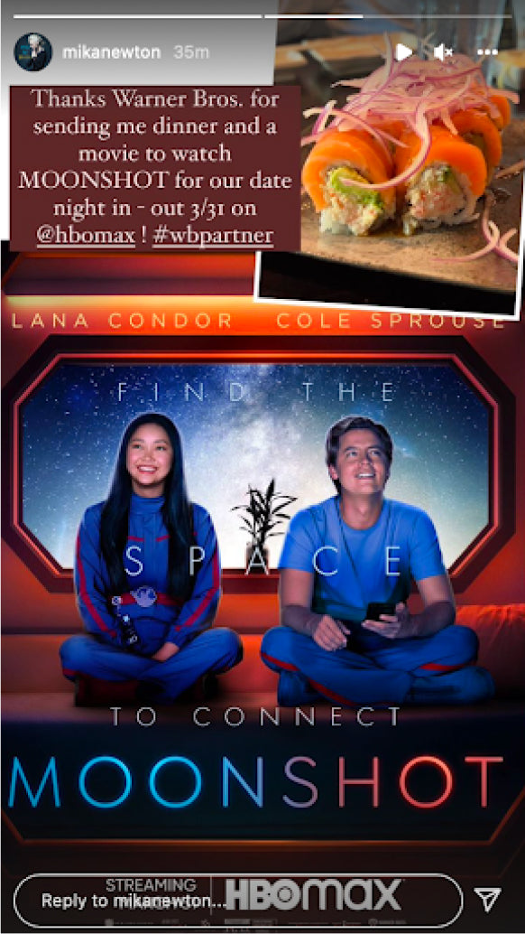 NEWHOUSE identified and targeted influencer couples that fit MOONSHOT’s key thematic pillars such as: sci-fi couple fans, college student couples, diversity couples, LGTBQIA+ couples, fans of Lana Condor, fans of Cole Sprouse, etc. for an out-of-this-world, date night campaign that garnered gratis social support for the film and its release date.