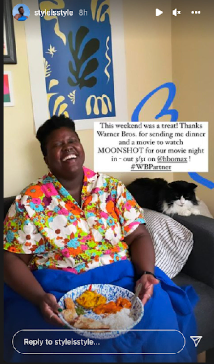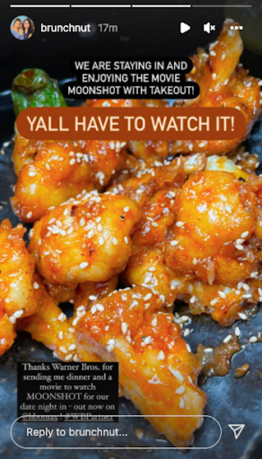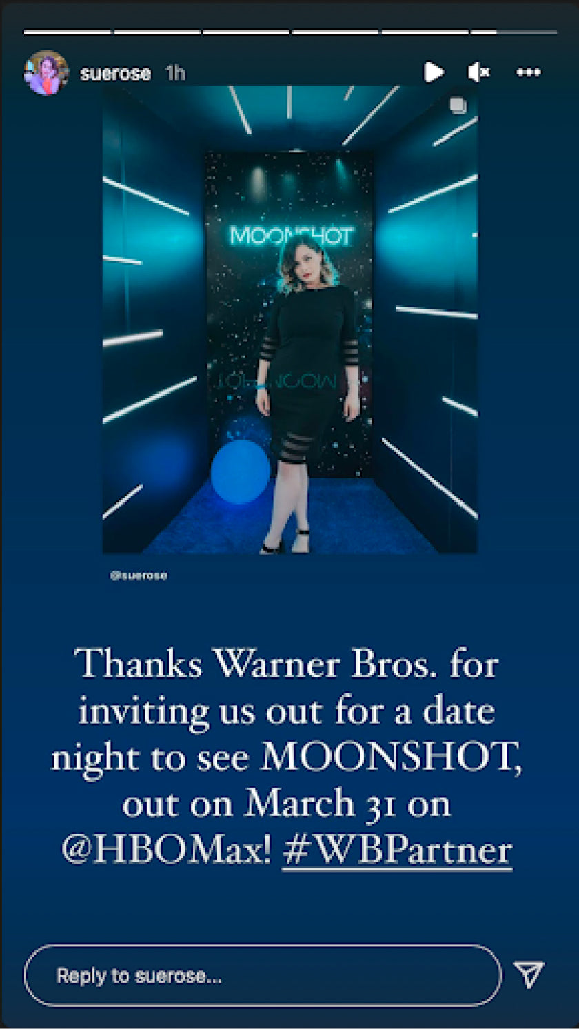 In exchange for influencers’ social support, all confirmed influencers received a $100 UberEats code to purchase dinner for a romantic movie night in. Some influencers received an advance screener link to the film and while other influencers already had an HBO Max subscription to watch the film on release date. Influencers posted support on days leading up to release i.e. March 29 and March 30, plus also posted on the film’s release date of March 31, 2022.